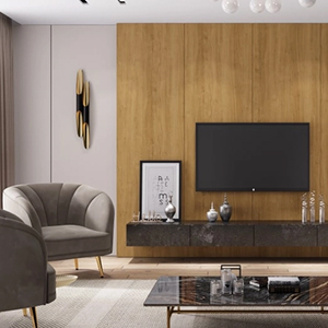 Стеновые панели: 3D-геометрия, комбинация материалов (дерево + металл, МДФ + подсветка), встроенные ниши и полки.